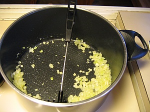 Kuullota sipulit pienellä lämmöllä. Lisää myös pieneksi silputtu valkosipuli. |
