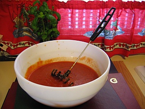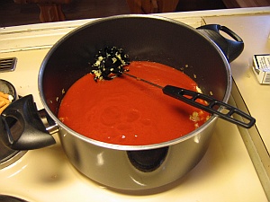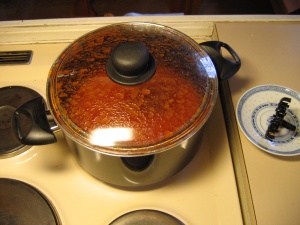 Laita kansi kattilan päälle, sillä tomaattikastike pulppuaa melkoisella voimalla, varsinkin sähköliedellä on hankala säätää lämpöä. |