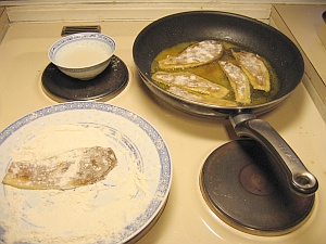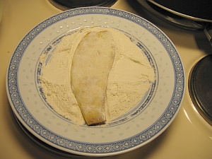 Leivitä sellaisenaan viipaleet jauhossa. |