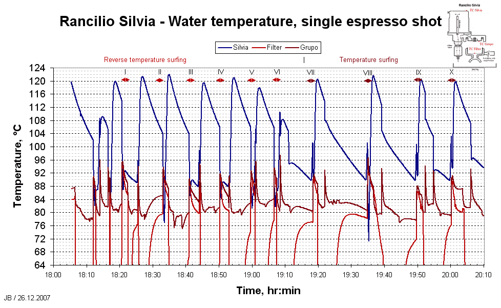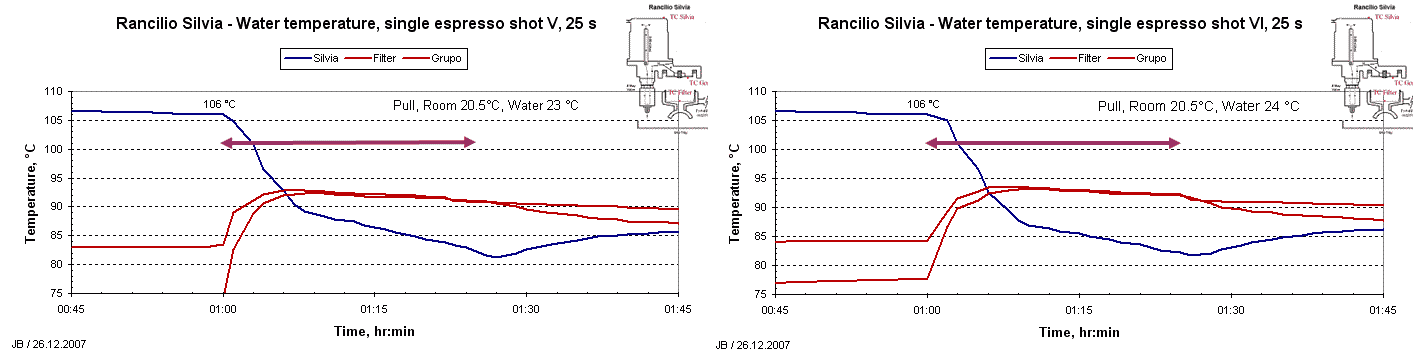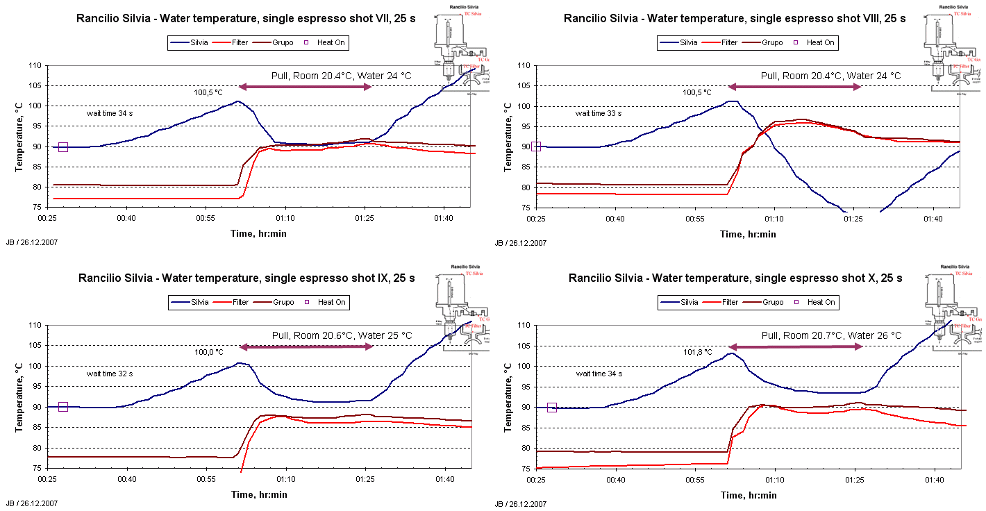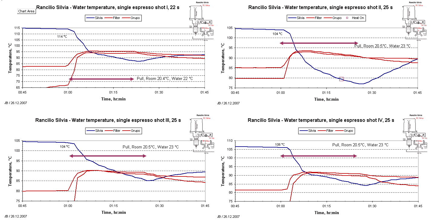 degrees by the end of the brew. Silvia's heating element starts five seconds