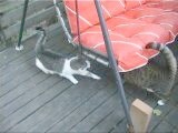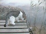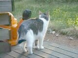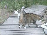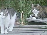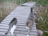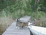 Kissamme Nöpö (ikäneito, 4 kg, vaalea/raidallinen) ja Mikke (vanhapoika, 7 kg, tumma/raidallinen) ovat aina olleet puhtaasti sisäkissoja, mutta nyt ovat päässeet elämään vapaasti luonnossa. |