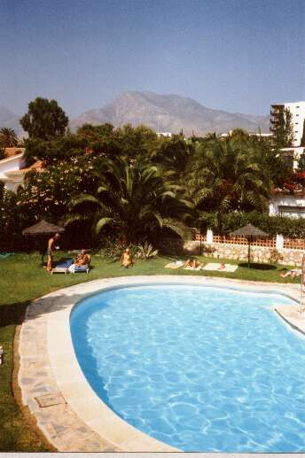 Aamulla sitten Jari meni parvekkeelle, katseli hieman silmät pyöreinä ensin hotellin puutarhaa, sitten edessä siintävää merinäkymää ja sitten sivummalla näkyviä vuoria ja oli siinä silmänräpäyksessä myyty. Olimme tulleet Torremolinokseen ja tarkemmin Benalmádenan kylään.